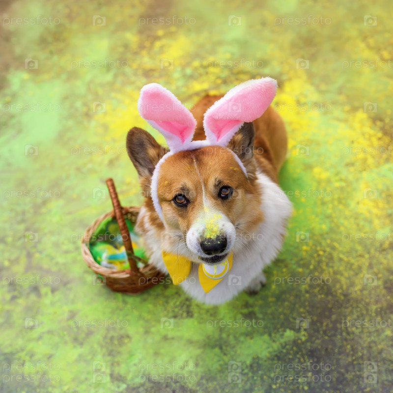 Милый щенок корги в ушах пасхального кролика сидит с разноцветным яйцом в зубах в окружении ярких цветов холи