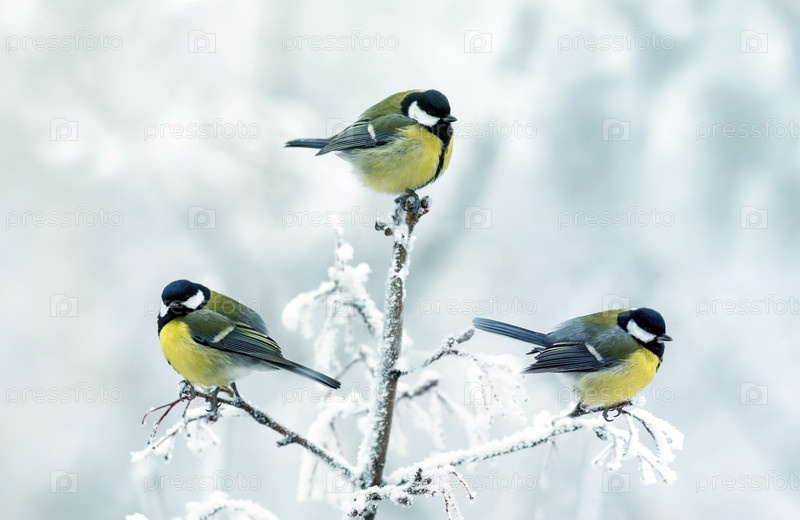 Три маленькие синицы сидят в зимнем парке на ветвях, покрытых белым инеем
