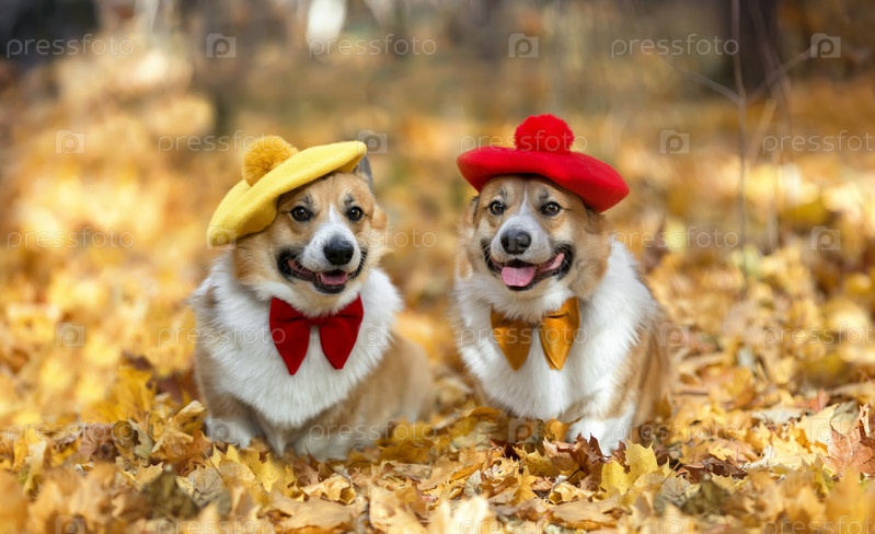 Две одинаковые собаки корги в беретах сидят в осеннем парке среди золотых опавших листьев
