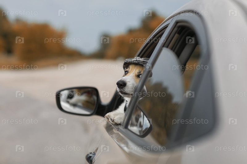 Милый щенок корги в кепке высунулся из окна проезжающей машины