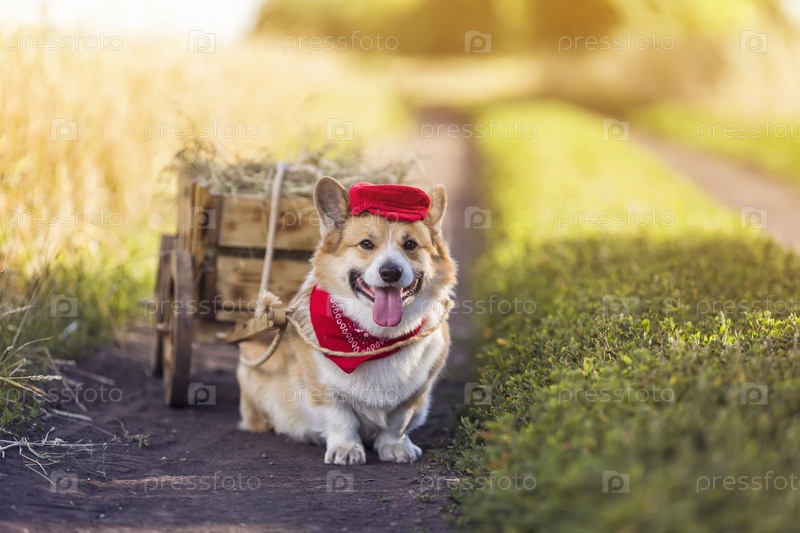 Милая собака корги, запряженная в деревянную тележку с сеном, гуляет по летнему солнечному полю в красной кепке кучера