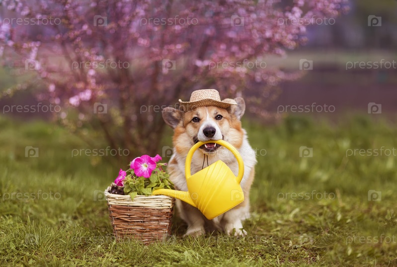 Милый щенок корги держит в зубах лейку и поливает цветы в саду на участке в деревне