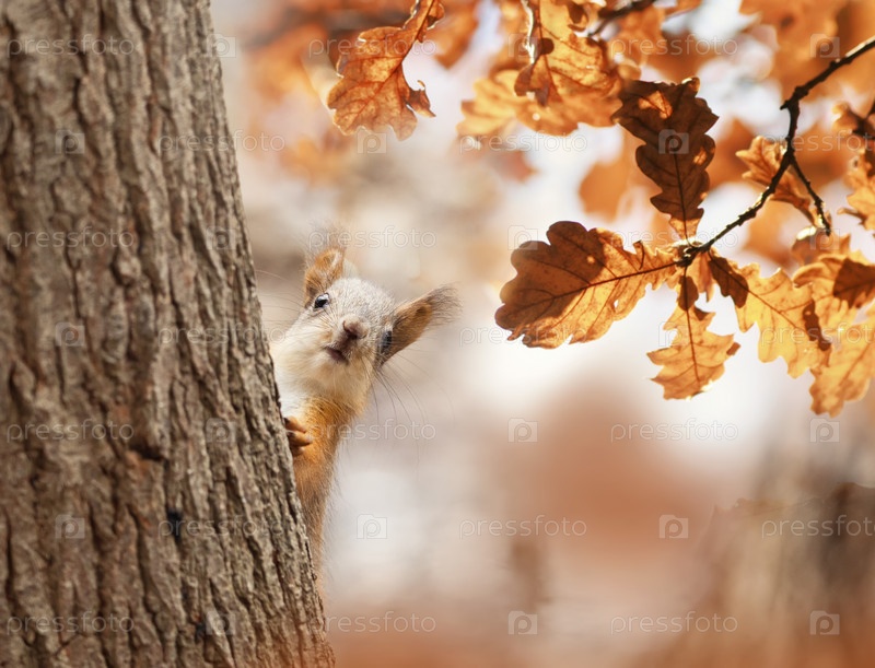 Милая маленькая белка сидит на стволе дуба с яркими осенними золотыми листьями