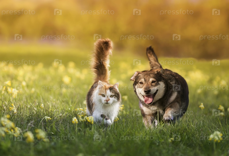 Пара друзей кошка и собака весело бегут по летнему цветущему лугу