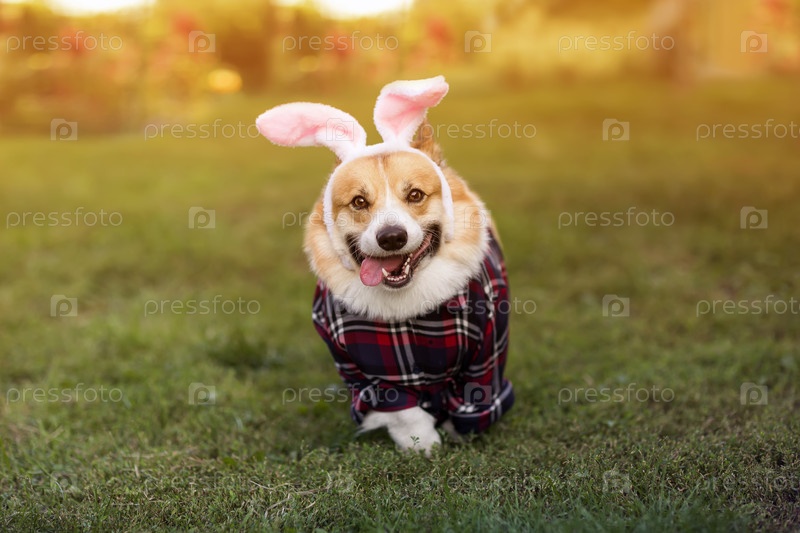 Очаровательный щенок корги пемброк бежит по зеленой траве в розовых кроличьих ушах и клетчатой рубашке