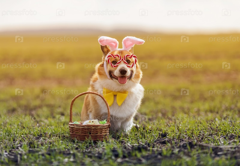 Милый щенок корги в кроличьих ушах и праздничных очках с пасхальной корзиной яиц сидит на весеннем лугу