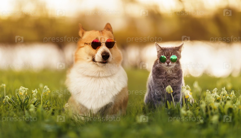 Милые друзья кошка и собака в солнечных очках сидят на летнем цветущем лугу