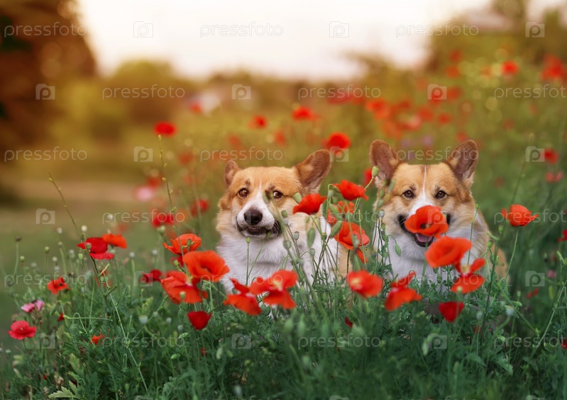 Две милые собаки корги сидят на солнечном летнем лугу среди цветов красных маков