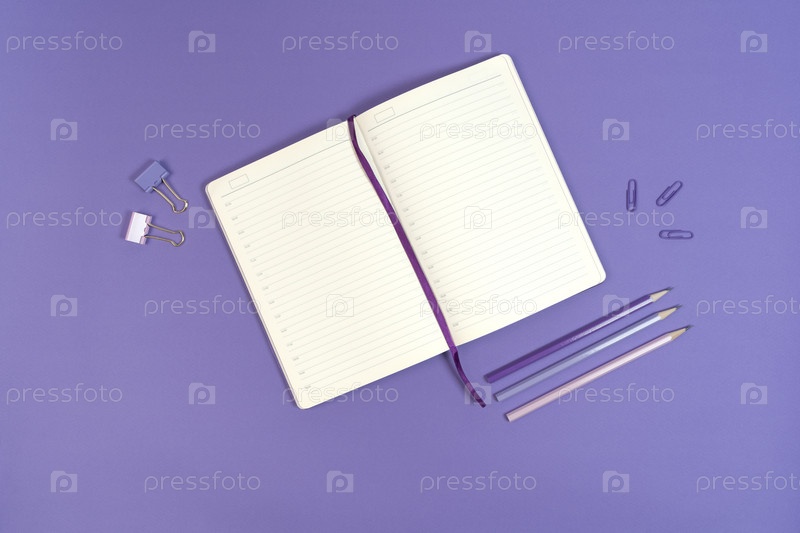 Откройте пустой дневник и карандаши на фиолетовом фоне