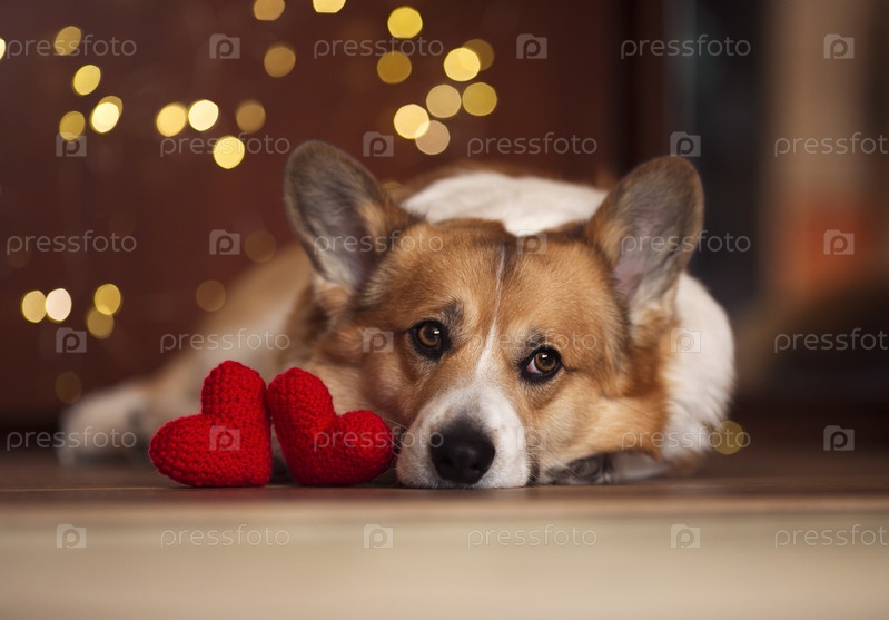 Милый портрет собаки корги лежит на полу рядом с двумя любовными символами вязаных красных сердец