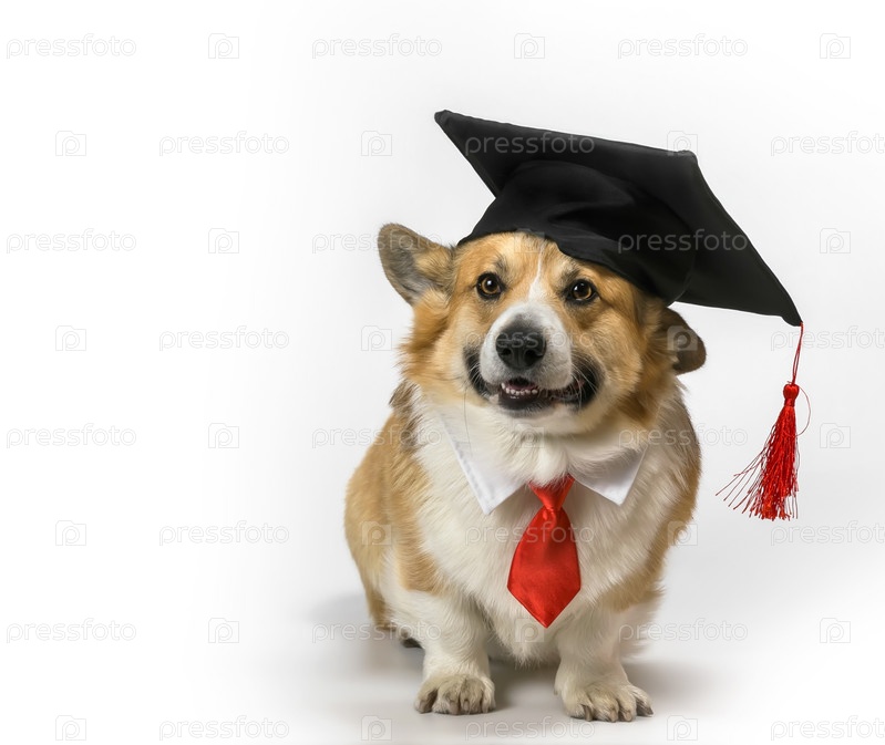 Забавный щенок корги сидит на белом фоне в студенческой шляпе и красном галстуке