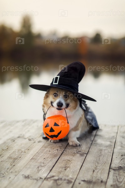 Милый щенок корги в праздничной черной кепке сидит на мосту с тыквой на хэллоуин
