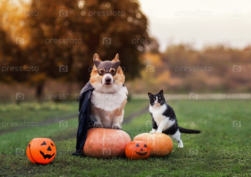 Милые забавные друзья собака корги в черной карнавальной кепке и плаще и кот, сидящий на оранжевых тыквах Хэллоуина в осеннем саду