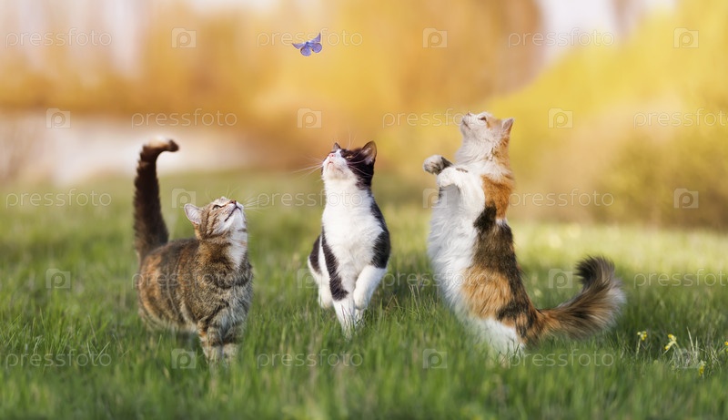 Три разных кота ловят маленькую голубую бабочку на солнечном летнем лугу