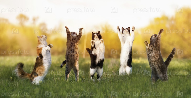 Группа из пяти красивых и разных кошек стоит на зеленой траве на задних лапах и тянется к солнечному небу