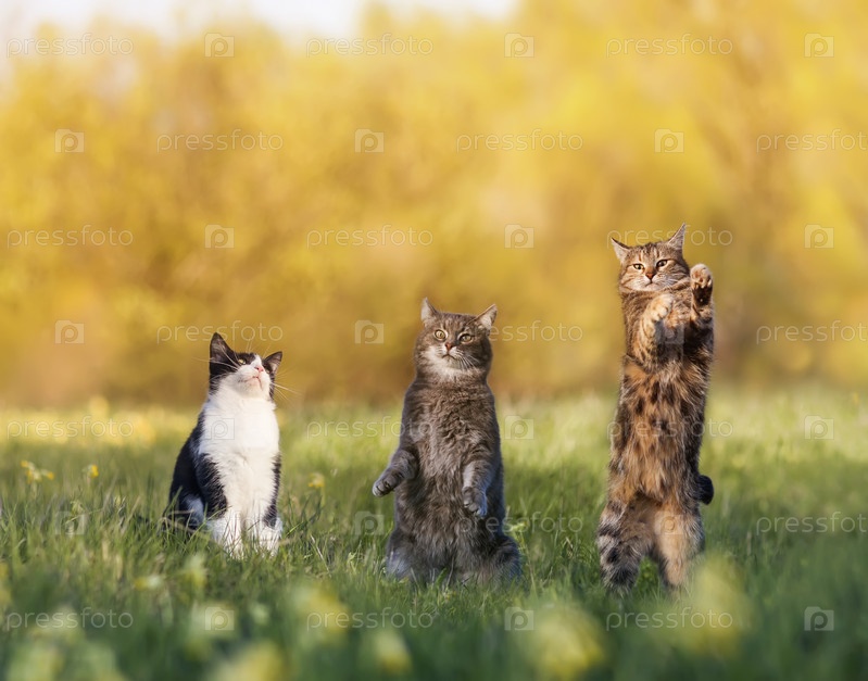 Три забавных кота гуляют и прыгают по солнечному летнему лугу с забавными лицами