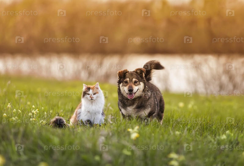 Два милых пушистых друга, полосатая кошка и веселая собака, гуляют по солнечному весеннему лугу