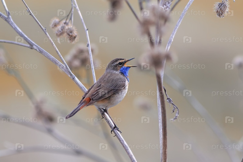 Красивый самец певчей птицы варакушка сидит на ветвях лопуха и поет