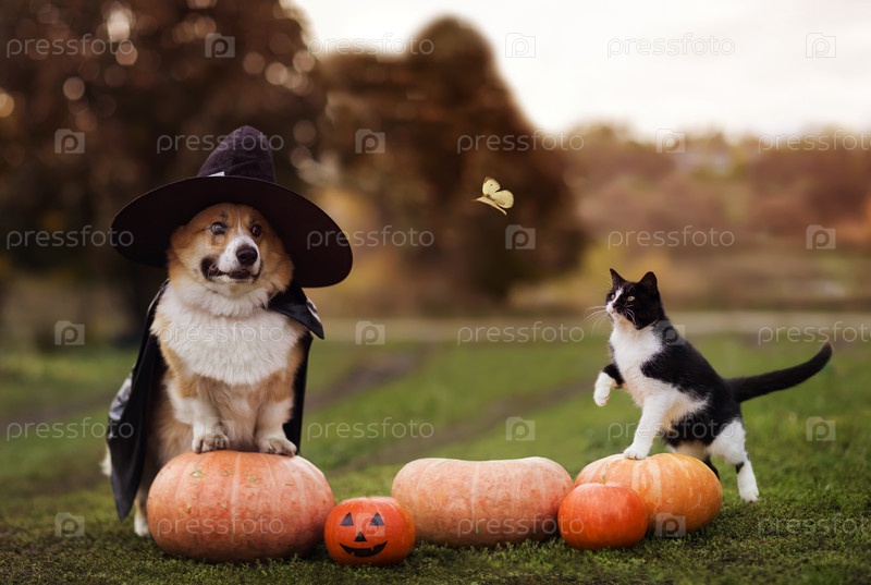 Веселые друзья собака корги в черной карнавальной кепке и плаще и кот сидит на оранжевых тыквах на Хэллоуин в осеннем солнечном саду и ловит бабочку