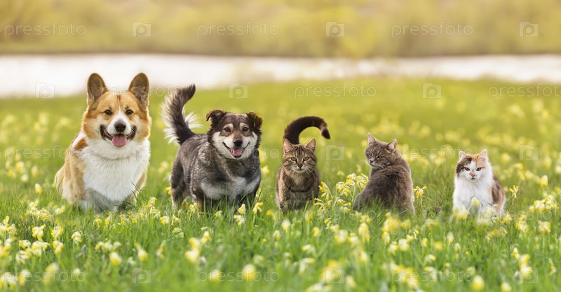 Различные пушистые друзья собак и кошек сидят на зеленой траве на солнечном весеннем лугу
