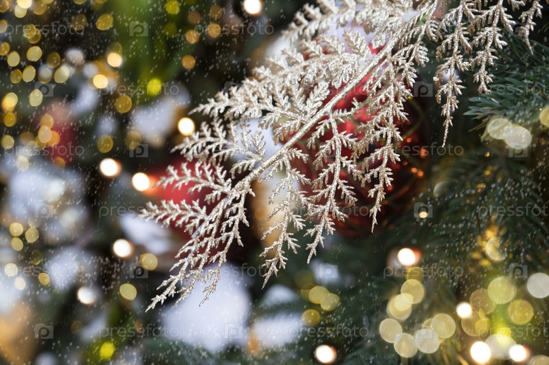 Рождественский орнамент с золотой ветвью, абстрактные снежинки и декоративный светлый боке. Открытка с Рождеством и Новым годом