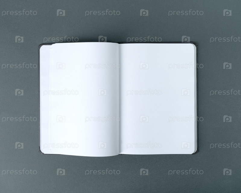 Пустая открытая книга. Журнал, брошюра или блокнот на фоне серой бумаги. Макет адаптивного дизайна
