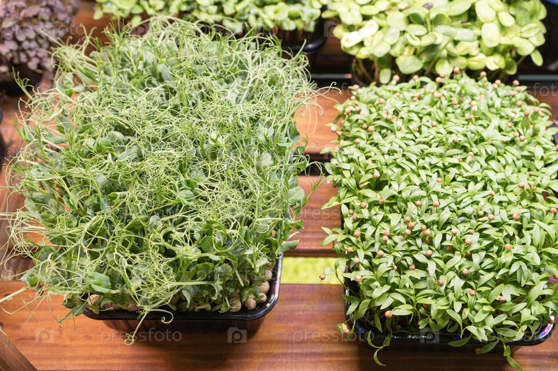 Органическая сырая зеленая пища. Различные виды ростков микрозелени. Микрозелень