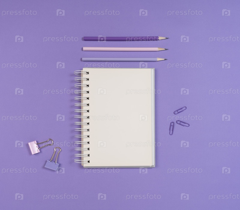 Рабочая область на фиолетовом фоне с пустой книгой Sketch, карандашами и клейками