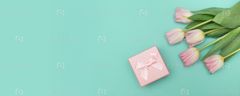 Розовая подарочная коробка и букет розовых тюльпанов. Обои или баннер для сувенирного магазина, цветочного магазина или ювелирного магазина. День святого Валентина, День матери