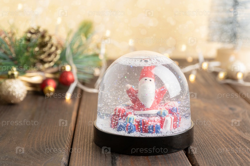 Снежный шар с Дедом Морозом. Выборочный фокус и огни боке. Зимняя композиция