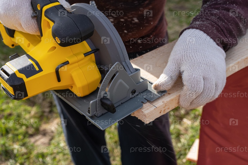Мужчина распиливает доску циркулярной пилой