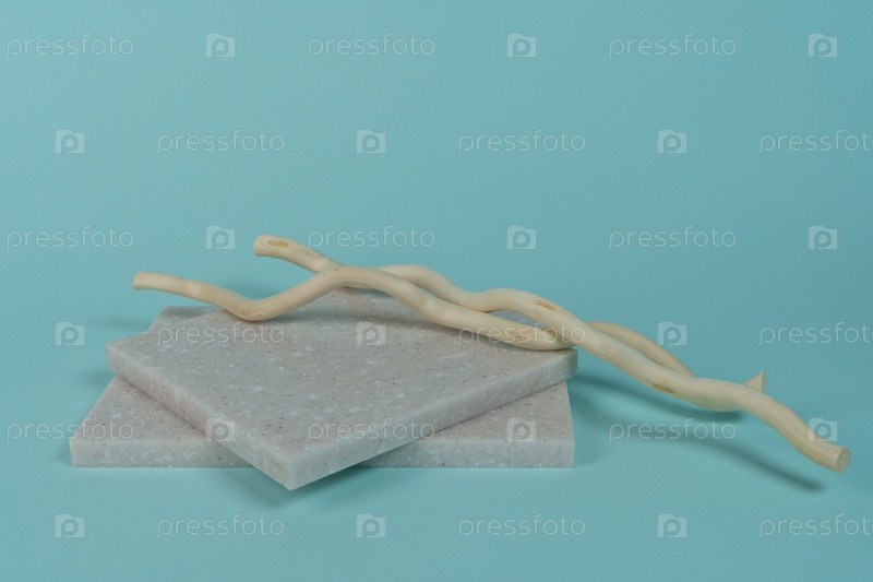Стенд из натурального камня для презентаций и выставок. Макет, пустой подиум с ветками для косметического продукта