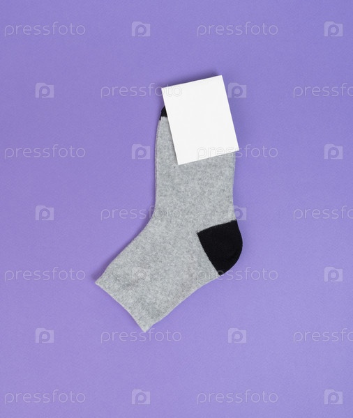 Серые детские носки на фиолетовом фоне. Носки с белой этикеткой для вашего дизайна. Макет