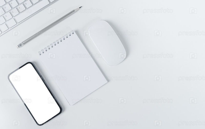 Белый офисный стол, концепция бизнеса и образования. Смартфон с пустым экраном, вид сверху, пространство для копирования, макет