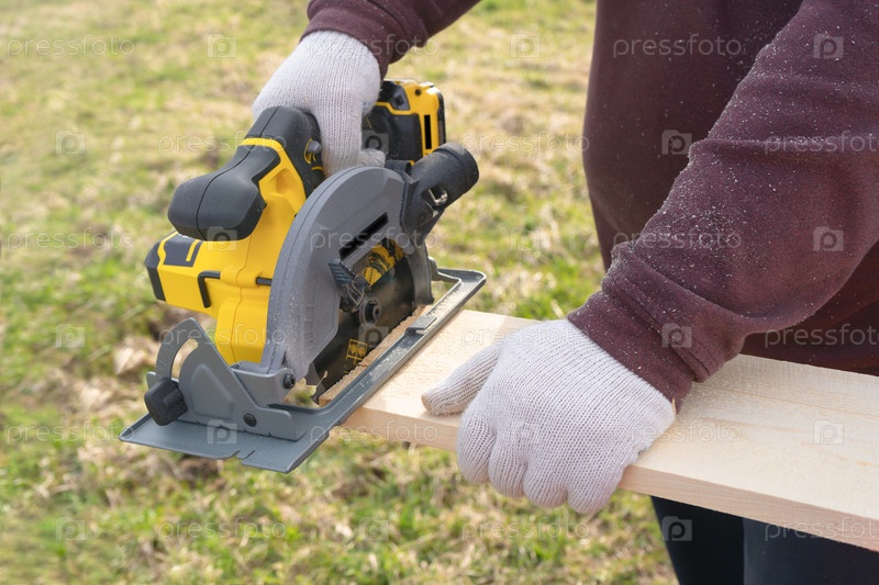 Мужчина распиливает доску циркулярной пилой