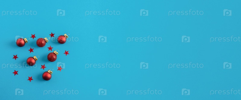Рождественская композиция. Красные рождественские шары и узоры звезд на синем фоне. Плоская планировка, вид сверху, пространство для копирования