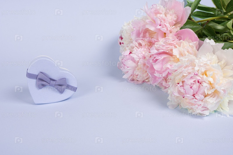 Маленькая подарочная коробка в форме сердца и пионы на синем фоне. Шаблон для праздничных открыток. Копирование пространства, выборочный фокус с малой глубиной резкости