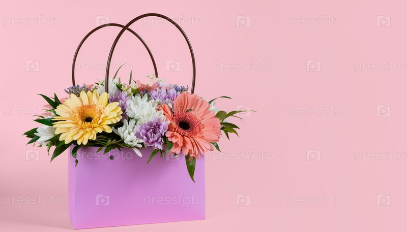 Букет цветов в подарочном мешочке. Скопируйте пространство, макет