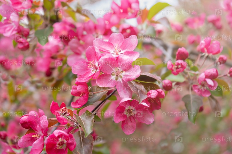Цветущая розовая яблоня в весеннем саду. Розовые цветы на дереве