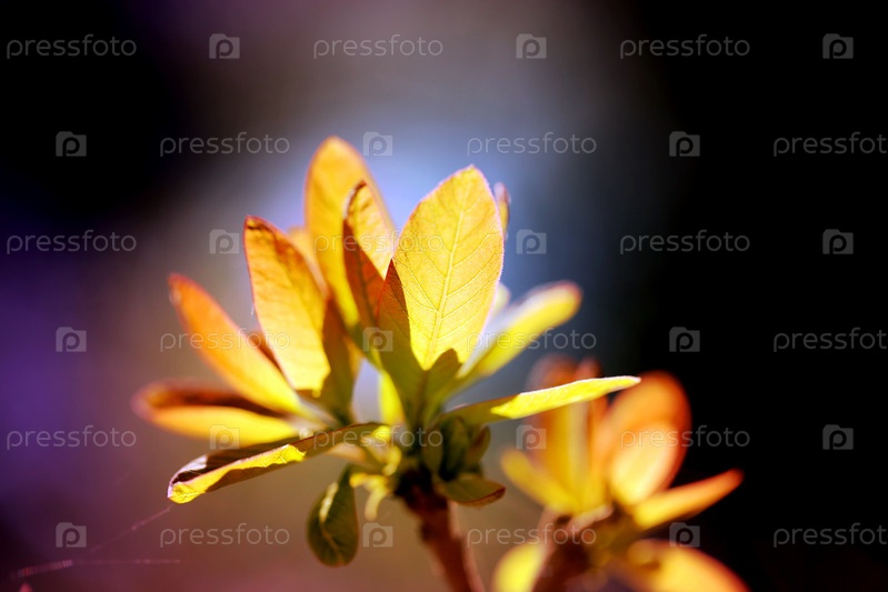Красивое фото молодых весенних листьев деревьев на разноцветном фоне