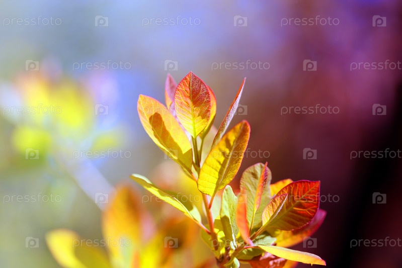 Красивое фото молодых весенних листьев деревьев на разноцветном фоне