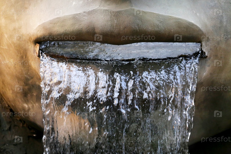 Красивый фонтан вытекает изо рта с большими губами статуи, сфотографированной крупным планом