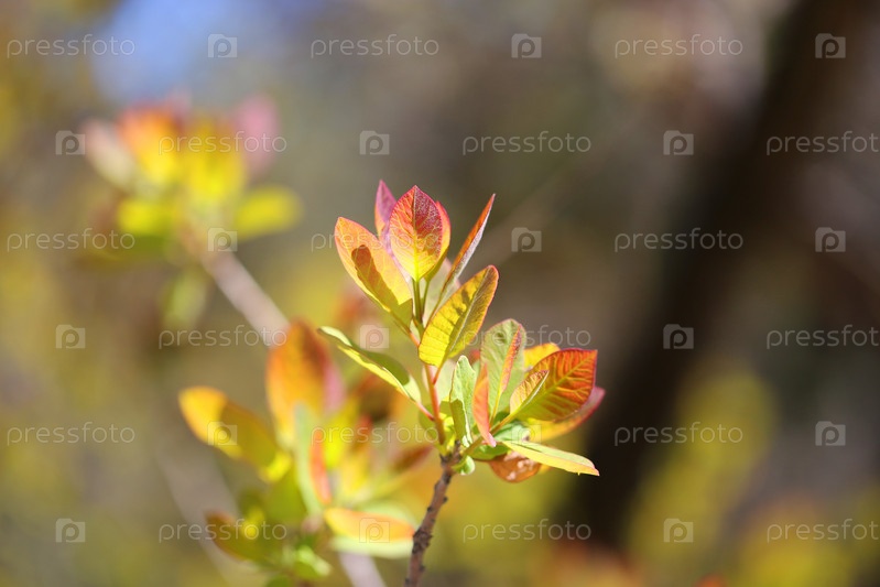 Красивое фото молодых весенних листьев деревьев на разноцветном фоне