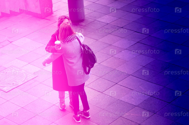 Красивые молодые девушки радостно обнимаются на улице