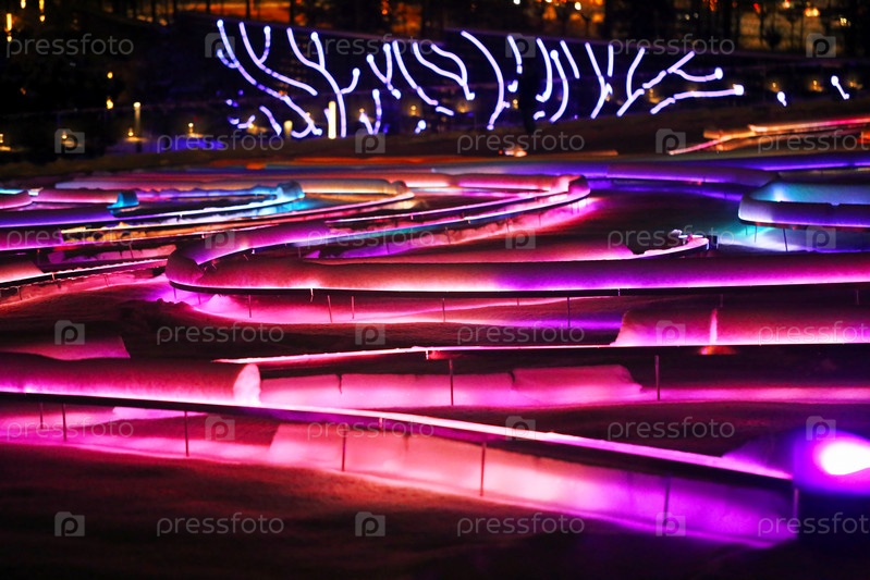 Красивое разноцветное ночное освещение в Галицком парке в Краснодаре