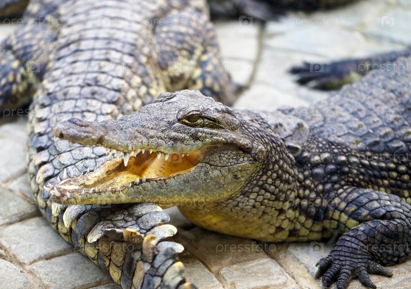 Красивые зубастые рептилии-крокодилы стоят на земле, сфотографированные крупным планом