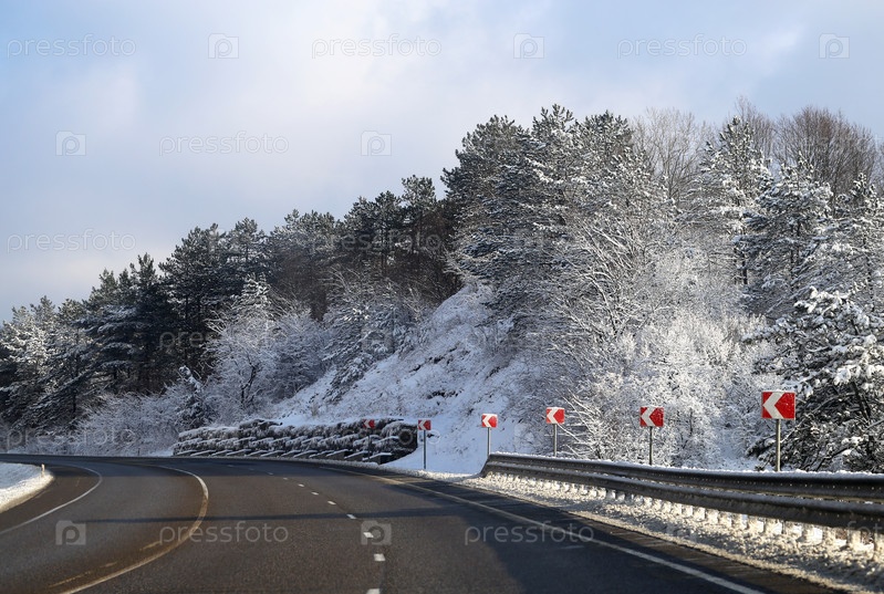 Красивая зимняя горная дорога с заснеженными деревьями сбоку