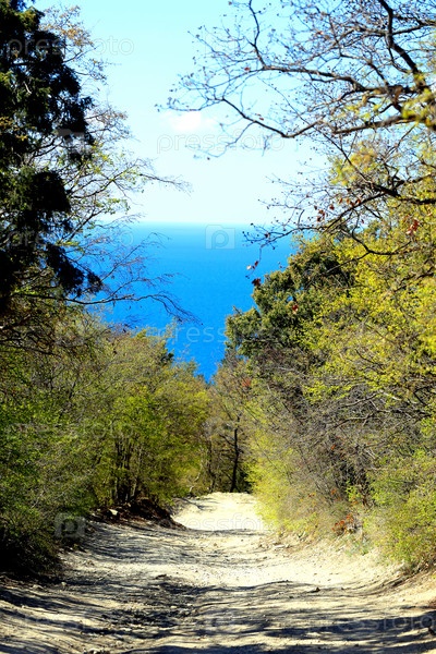 Красивое фото дороги в можжевеловом лесу на фоне синего моря
