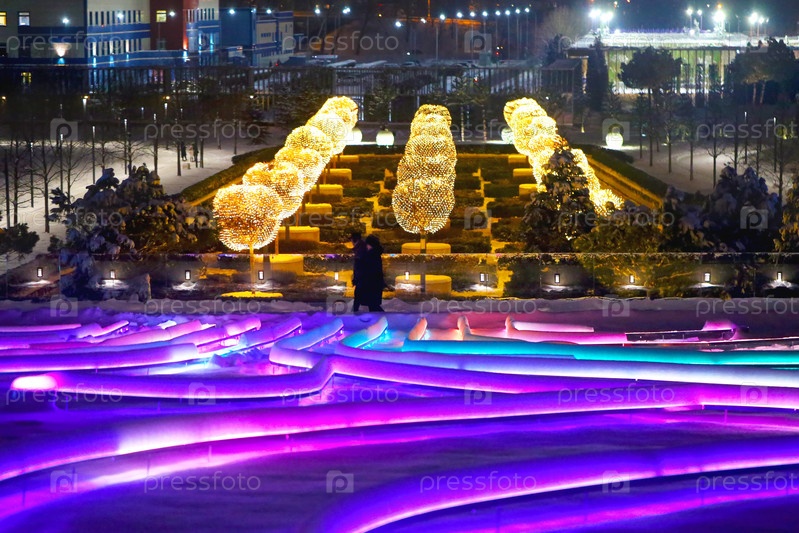 Красивое разноцветное ночное освещение в Галицком парке в Краснодаре