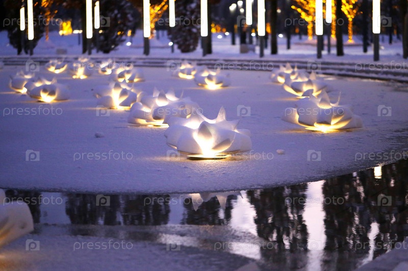 Красивые белые лилии цветут лампы на заснеженном пруду среди льда и снега